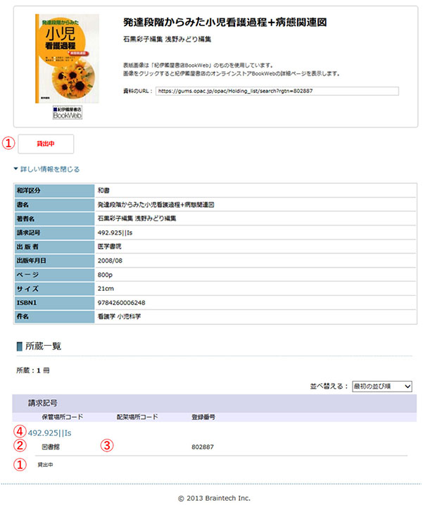 図書館以外の場所(研究室など)が表示されている場合は利用できません。 - ③配架場所コード・・・