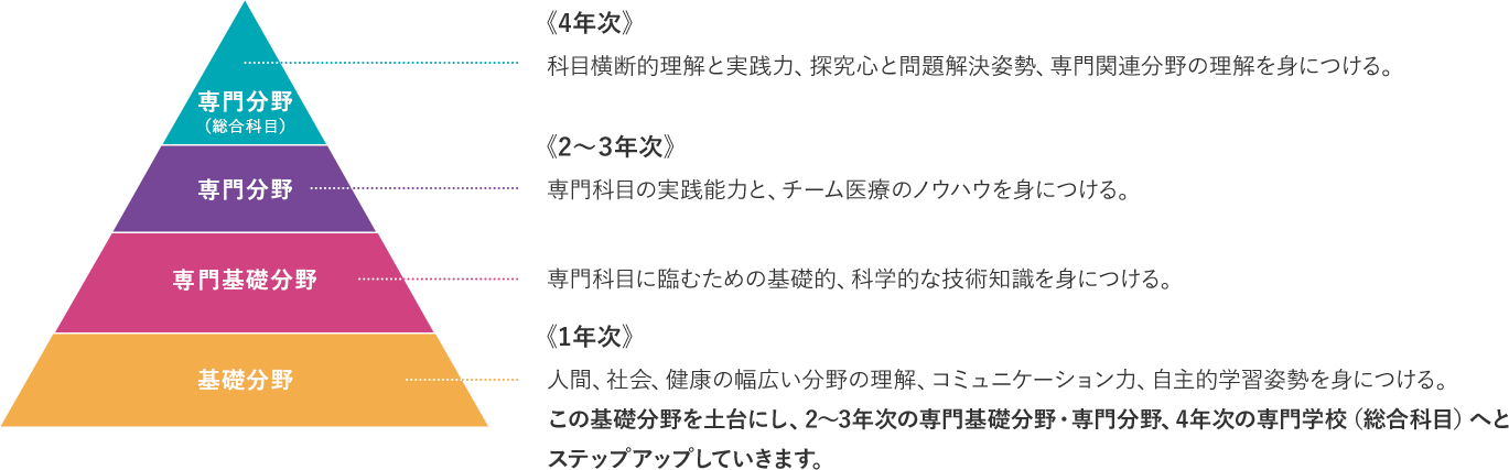 - 人間、社会、健康の幅広い分野の理解、コミュニケーション力、自主的学習姿勢を身につける。この基礎分野を土台にし、2〜3年次の専門基礎分野・専門分野、4年次の専門分野(総合科目)へとステップアップしていきます。