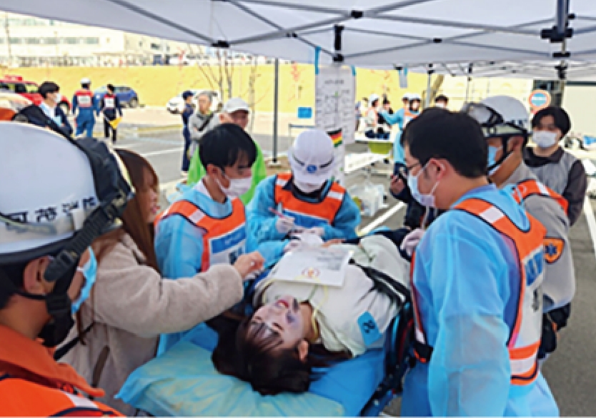 本学では、国際・災害看護論を通じて災害が人々に与える影響と看護の役割を深く学修。地震体験車による実習で防災意識と即応力を養います。さらに中部国際医療センターの協力により、DMATの目的・活動、能登半島地震や東日本大震災、熊本地震での実際の支援、病院と被災地の救急医療の違い、災害トリアージまで、現場に根ざした知識と判断を身につけます。
