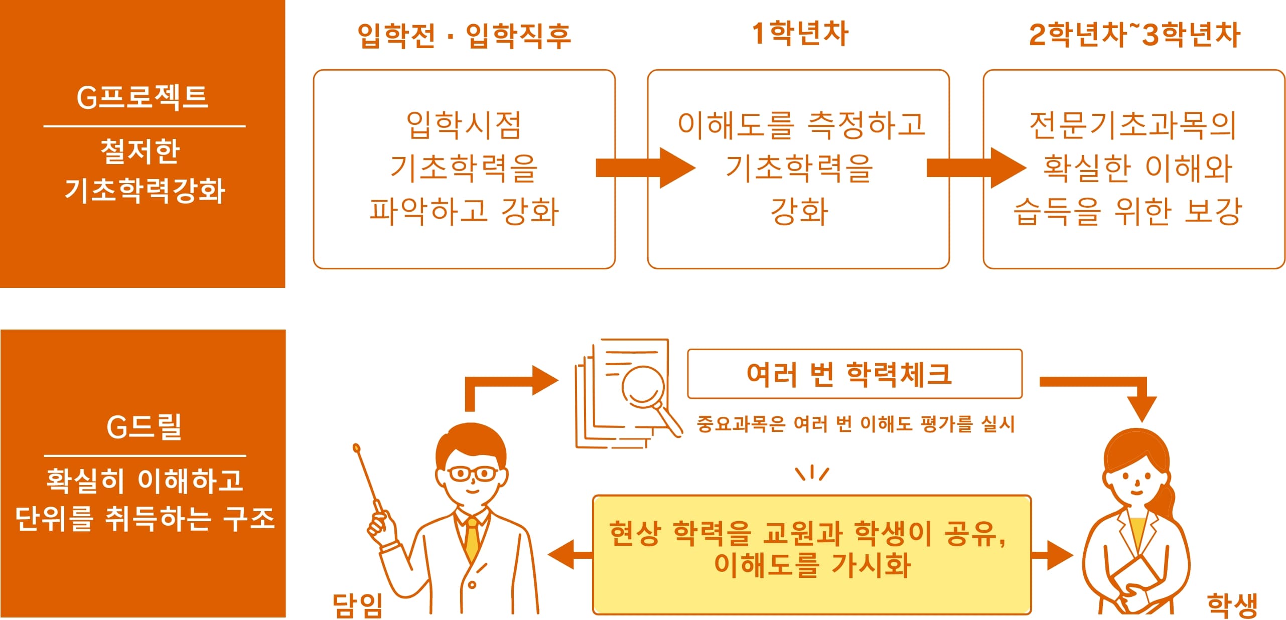 약학을 배우는 토대가 되는 화학과 생물 과목을 입학전부터 서포트. 부족한 학생에 대해서는 G프로젝트, G드릴로 철저한 기초학력강화에 임하고 있습니다. 또한 충실한 임상약학교육과 미래의 약학에 대응할 수 있도록 교육내용도 업데이트 하고 있습니다.