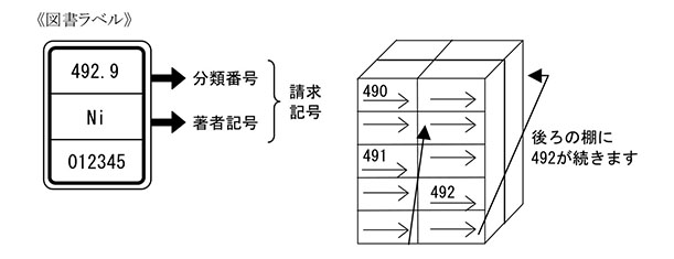 図書の背に貼ってあるラベルの番号順に並んでいます。ラベル上段の数字(分類番号)でまず並び、同じ分類番号の中では2段目のアルファベット(著者記号)の順に並んでいます。