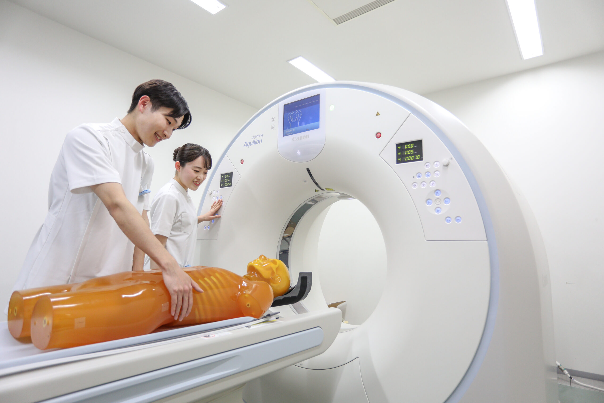 これは何の装置だろう?このオレンジの人形を患者さんに見立てて実習するの? これは「X線撮影装置」。いわゆるX線写真を撮ることができるよ。オレンジの人形は「ファントム」と言って、人体に近い素材でできているんだ。撮影する部位によって撮影法が決まっているから、このファントムを使って実際に撮影して学んでいくんだ。他にも、撮影条件も部位によって決まっているし、放射線の被ばくも考えながら撮影するんだよ。 へー!装置の操作だけじゃなくて、撮影法や撮影条件も考えながら撮影しているのか。まさにプロフェッショナルな仕事だね!