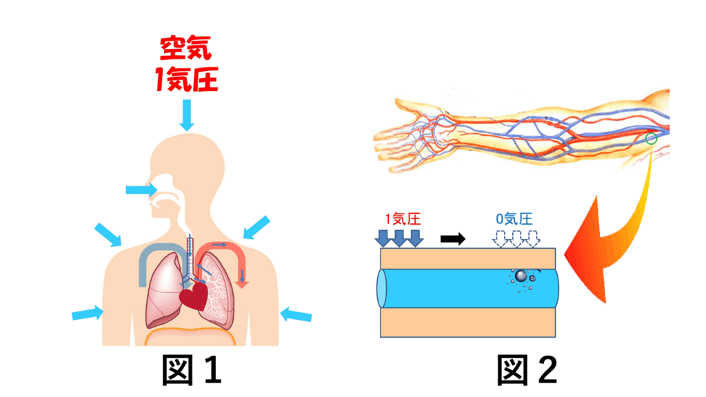 このような状態を「減圧症」と呼びます。これは「体が沸騰している」のではなく、血液に溶けていた二酸化炭素が溶けきれなくなって気体として出てくる現象です。特に体の表面近くを流れる静脈はこの気圧変化の影響を受けやすく、急激に人体の周りの気圧が下がると、溶け出した泡が肺にまで流れ込み、死に至ってしまう。だからこそ、呼吸するための空気の圧力と、体を押さえる空気の圧力は、同じくらいであることがとても大切なんです。