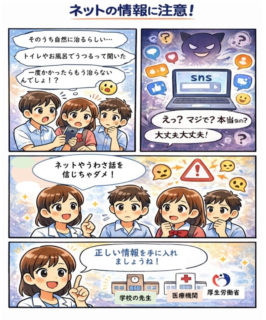 インターネットやSNSでは、性感染症についてさまざまな情報が氾濫しています。中には、「そのうち自然に治るらしい」「トイレやお風呂でうつるって聞いた」「一度かかったらもう治らないんでしょ?」といった話を目にしたことがある人もいるかもしれません。友だち同士の会話や、コメント欄の書き込みを信じてしまうこともあるでしょう。しかし、実際には、多くの性感染症は自然に治ることはなく、きちんと検査や治療を受けることが大切です。一方で、学校や家のトイレを使ったり、同じお風呂に入ったりしただけで感染することは、ほとんどありません。だからこそ、不確かな情報や自分に都合の良い情報だけを信じるのではなく、情報元がしっかりとした正しい情報を得ることが大切です。