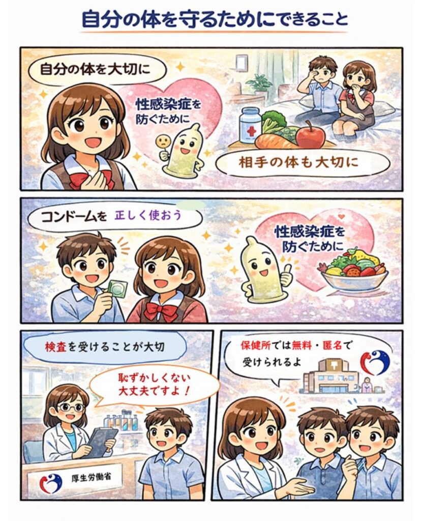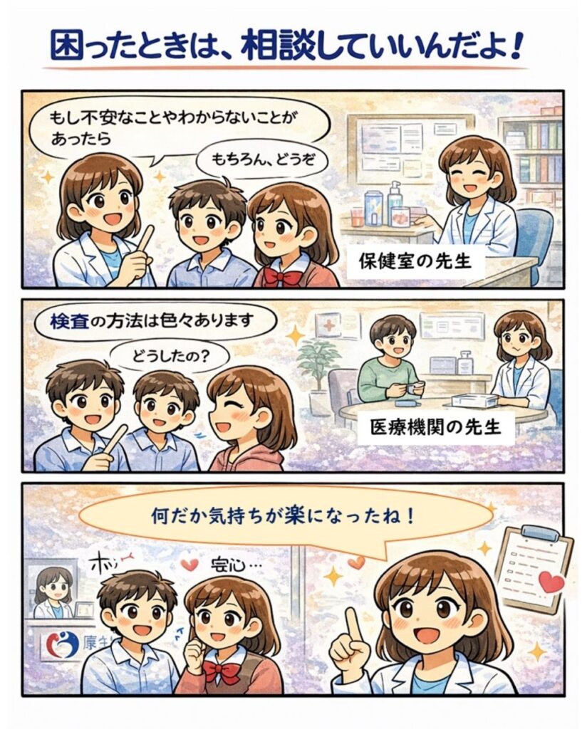 もし不安なことやわからないことがあったら、一人で悩まず、信頼できる大人に相談してください。たとえば、学校の保健室の先生に「ちょっと聞きたいことがある」と声をかけるだけでも構いません。家族や医療機関の先生など、話を聞いてくれる人は必ずいます。相談することは「弱いこと」ではなく、自分を守るための前向きな行動です。性感染症について知ることは、「怖い話」を知ることではありません。正しい知識を持つことで、不安が減り、落ち着いて行動できるようになります。そしてそれは、自分の体を大切にすることだけでなく、相手のことを思いやることにもつながります。わからないままにしないこと、正しく知ることが、あなた自身を守る第一歩なのです。