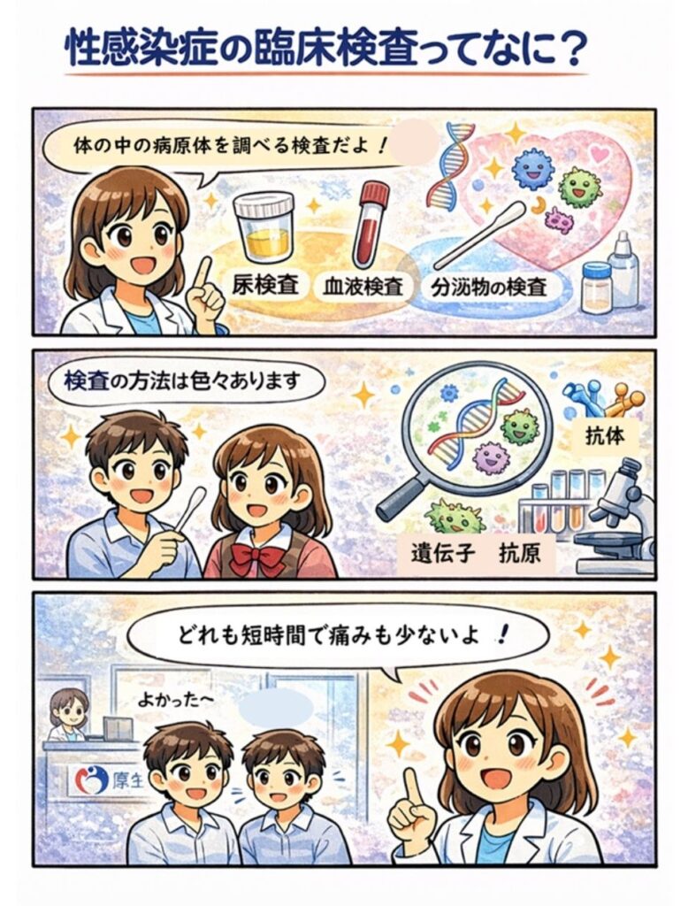 性感染症の検査とは、体の中に感染症の原因となる細菌やウイルスがいるかどうかを調べる検査のことです。見た目や体調だけではわからないことが多いため、検査によって正しく知ることがとても大切です。