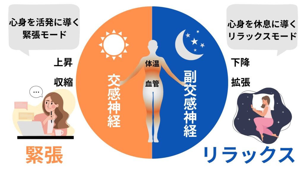 深部体温が下がり副交感神経(リラックスモード)が優位になることで心拍や呼吸がゆっくりになり、体が休息モードへ切り替わります。