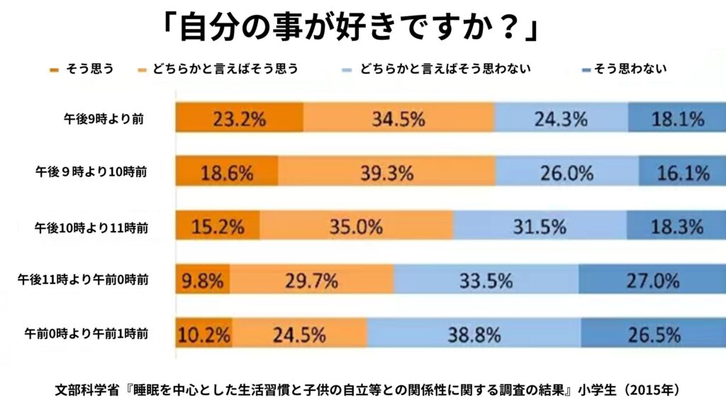 こちらは文部科学省による小学生を対象にした調査結果で、適切な睡眠時間をとっている人ほど自己肯定感が高いということが研究で明らかになっており、大人でも同様の結果がみられることが分かっています。感情をつかさどる「扁桃体」の働きが過剰に反応して不安や抑うつ状態が生じやすくなります。
