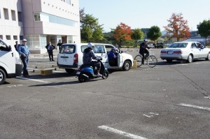 技能講習では自転車の飛び出しや車の急発進等を想定した危険予測とブレーキング(緊急制動)を体験することで