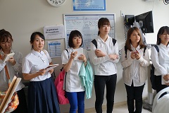 KCCでの放射線技師実習では、現地の放射線学科の学生の皆さんの協力を得て、採血や血圧測定、X線撮影の実習が行われ、終了後には現地の美味しいお菓子でのもてなしを受け、楽しく学べて印象に残る体験でした。