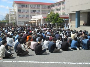 本訓練では避難出口・避難経路・避難場所の確認を行ったのちに、全学生が緊急放送を合図に実際の避難ルートを通り、避難場所である早緑ホール前に集まりました。
