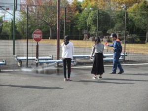 当日は寮内での火災を想定し、通報・避難・誘導の訓練を行い、消火栓や消火器を用いた