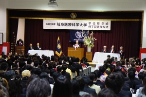 平成29年度 岐阜医療科学大学の学位授与式ならびに修了証書授与式が、平成30年3月20日 (火)に本学早緑ホールにて執り行われました。今年度は保健科学部275名、助産学専攻科20名、そして大学院1期生となる9名が本学を卒業し、医療機関、自治体、企業、大学院などのそれぞれが志す道へと巣立って行きました。
