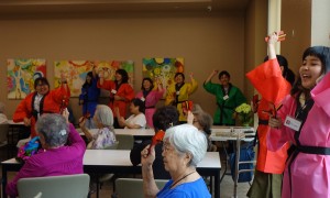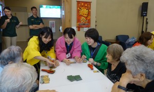 高齢者施設(The Plaza Waikiki)訪問では、日本の出身地紹介、盆踊りをお年寄りと一緒に踊って、坊主めくりゲームを楽しみました。準備は大変でしたが、施設のお年寄りが本当に楽しんでくださり、会話が弾んで・・一生懸命したことに対して目に見える評価がいただけて大変貴重な経験ができました。中には「私の息子(孫?)の嫁に来て!」と言われた学生さんもいました。