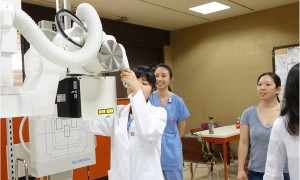 今年度は参加学生すべてが放射線技術学科の学生ということもあり、医療英語は、X線撮影に関する会話、注意事項や説明などの実践的な内容が組まれており、参加学生は将来使える英会話を学ぶことができました。放射線技術実習では、放射線技術学科の学生さんの協力で、X線撮影や採血実習を行いました。1年生は白衣を着るのも初めてで、X線撮影初体験のため楽しく実習ができました。