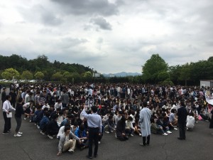 本訓練では避難出口・避難経路・避難場所の確認を行ったのちに、全学生が緊急放送を合図に実際の避難ルートを通り、避難場所である早緑ホール前に集まりました。