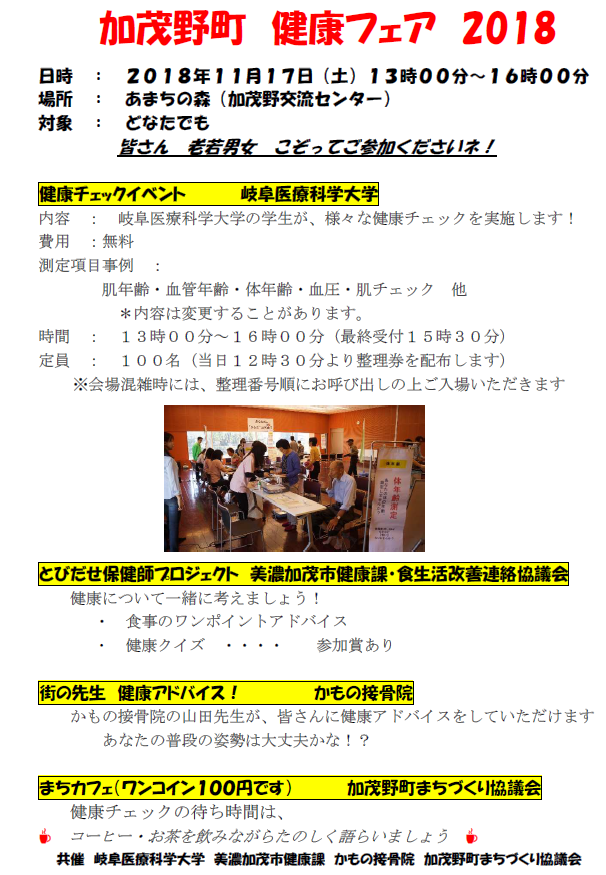 11月6日(土)、加茂野町まちづくり協議会、美濃加茂保健センター、食生活改善連絡協議会、かもの接骨院と共に下記日程にて加茂野町健康フェア2018を開催致します。