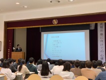 社会人1年目の卒業生を講師に招き、卒後に向けて準備することや心構えの話を聞きました。希望就職先を考えた時期や、施設見学等に参加するなど行動にしたこと、国家試験対策の勉強を始めたことが、臨床実習で為になったことなど、失敗したことや成功したことを盛り込みながらの学生生活の話や、社会人1年目の仕事の話でした。4年次で迎える就職・進学活動に対する意識付けや、4年次の学生生活をイメージできた様子だった。講演後の学生達は、就職・進学活動について、国家試験対策について、卒業研究に関して、学生生活最も忙しい4年次での学生生活を如何に活気よく有意義に過ごすことができるかのアドバイスをいただき、満足で豊かな表情でした。