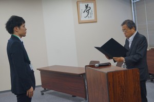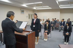 山岡学長からは「特待生として、他の学生の模範となる学生生活を心がけて欲しい」と