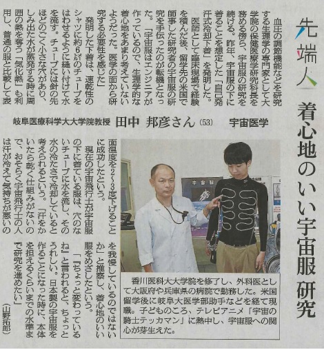 2月2日の朝日新聞経済面 「先端人」に田中大学院教授の「冷却下着」の紹介記事が掲載されました。田中先生は保健科学部、放射線技術学科の教授でもあります。宇宙服研究から生まれた特許に関するインタビューで、「着心地のいい宇宙服は、医学者であるからこそ研究できる。」ことを紹介した記事です。