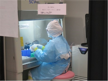 検査にあたっては、学内施設の安全対策を施した試験室で、マスク・防護服の着用など万全なリスク管理のもと作業を行っています。