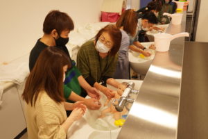 イベントには、可児市内在住の10組20名の夫婦が参加し、教員による講演とベビーモデルを抱いたりして、母体の変化や胎児の成長過程を学びました。また、助産師の資格を持つ教員らが沐浴の手順について指導を行い、新米パパが体験しました。アンケートにも「体験ができてよかった」などの感想が寄せられました。