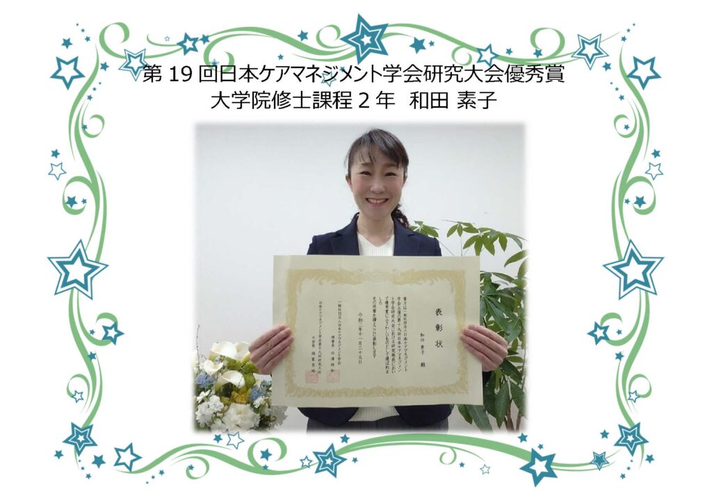 大学院修士課程2年生の和田素子さん(看護学科助教)が、第19回日本ケアマネジメント学会研究大会で発表し、優秀賞をいただきました。