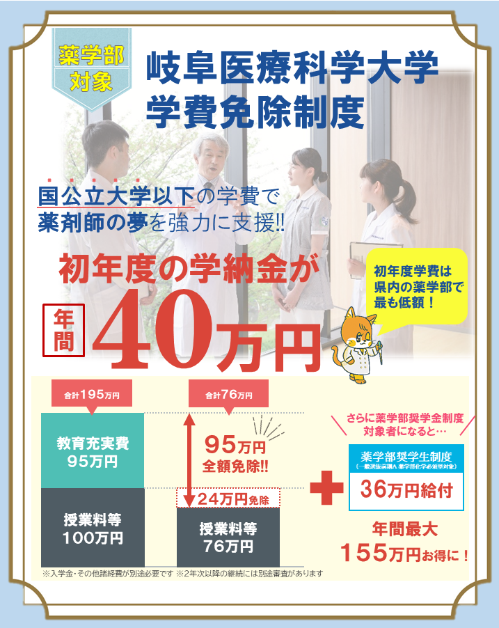 岐阜医療科学大学では、新たに薬学部を対象とした『学費免除制度』を創設しました。