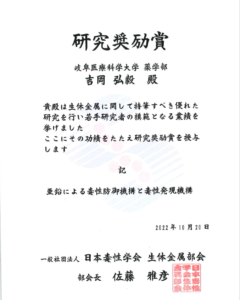 薬学部薬学科の吉岡弘毅講師がメタルバイオサイエンス研究会2022で研究奨励賞を受賞しました