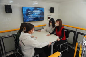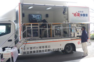 学生たちは地震体験車に乗車し、過去に発生した濃尾地震や今後の発生が予想される東海大地震を模した揺れを体感しました。
