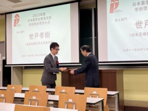 薬学部 薬学科 世戸孝樹准教授が 2023 年度の日本薬学会東海支部の学術奨励賞(受賞タイトル:迅速かつ高効率な光安全性評価系の戦略的開発)を受賞しました。7 月 8 日に実施された第 69 回日本薬学会東海支部 総会・大会にて授賞式・受賞講演が行われました。