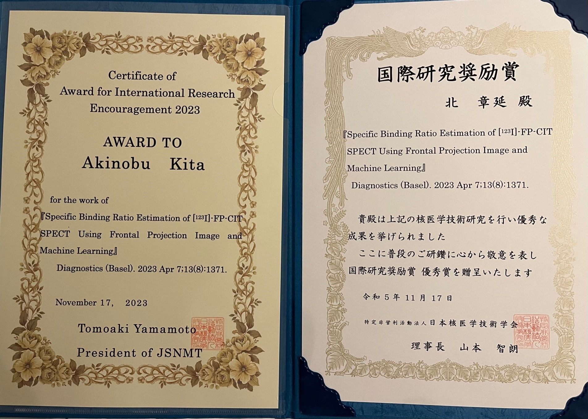 受賞研究(Specific Binding Ratio Estimation of [123l]-FP-CIT SPECT Using Frontal Projection Image and Machine Learning)の内容は、深層学習技術を核医学検査に適用し、極めて短い検査時間で検査結果の一部を得ることが可能な方法を開発したもので、その研究成果などが高く評価され、今回の受賞に至りました。
