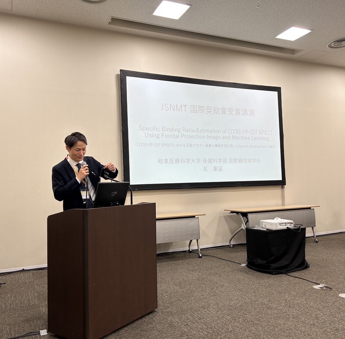 保健科学部放射線技術学科の北 章延准教授は、2023年11月16日から開催された第43回日本核医学技術学会総会学術大会において、国際研究奨励賞優秀賞を授与されました。北准教授は、授賞式に出席し、受賞に至った研究の内容について講演を行いました。