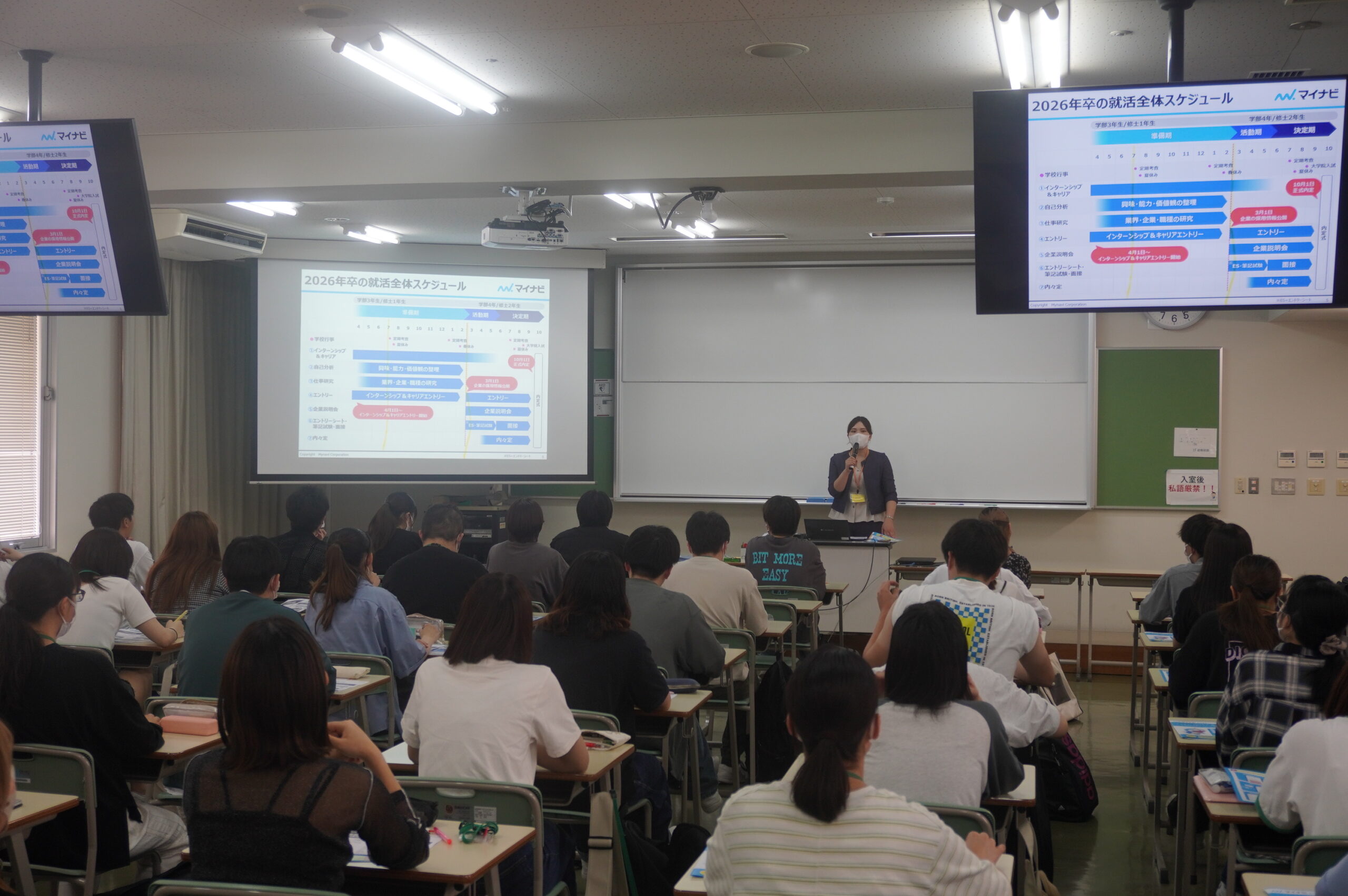 就職事情が時々刻々と変化する中、自己分析、就職先の研究などの大切さを説かれました。