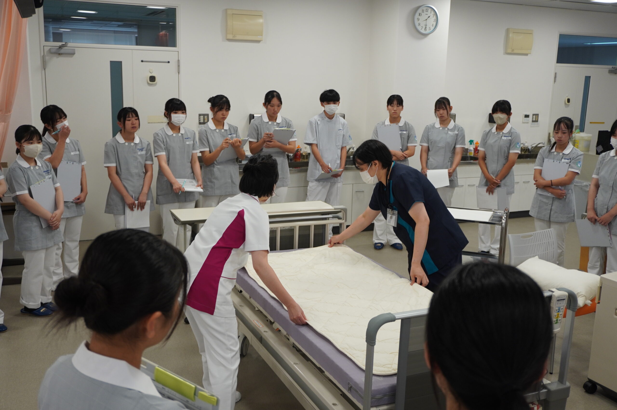 当日は、看護師をはじめとする医療従事者を目指す高校生23名が参加し、本学教員らの指導によるシーツ交換体験、本学学生との交流、本学卒業生の現看護師、現保健師、助産師の講話を行いました。看護師を目指す上で大切なことや自身の適正を感じてもらうとともに、自身の将来について具体的にイメージする機会となりました。