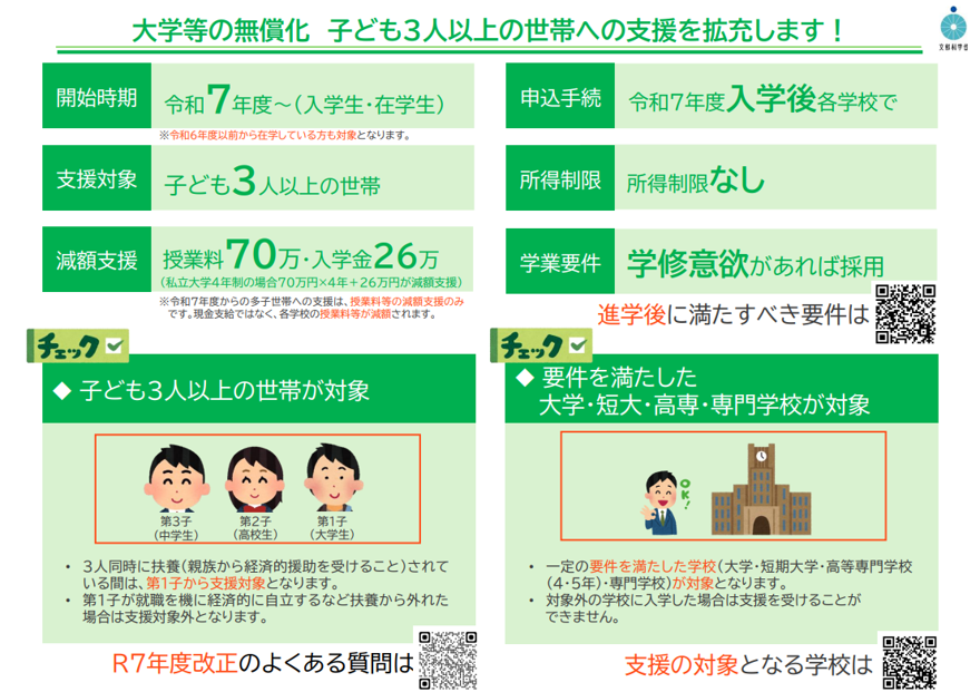 令和7年度からの「多子世帯に対する大学等の授業料等無償化」について