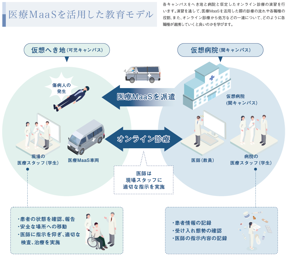 そこで本学では、最新の医療MaaS車両を導入し、全学部学科の学生が実践的なチーム医療教育を受ける教育プログラムを実施します。