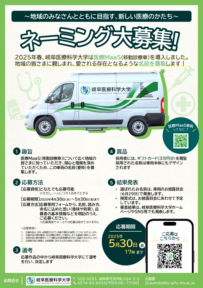 岐阜医療科学大学では、2025年春に導入した医療MaaS(移動診療車)について、地域の皆さまに広く親しまれ、愛される存在となるよう、愛称の一般公募を行います。