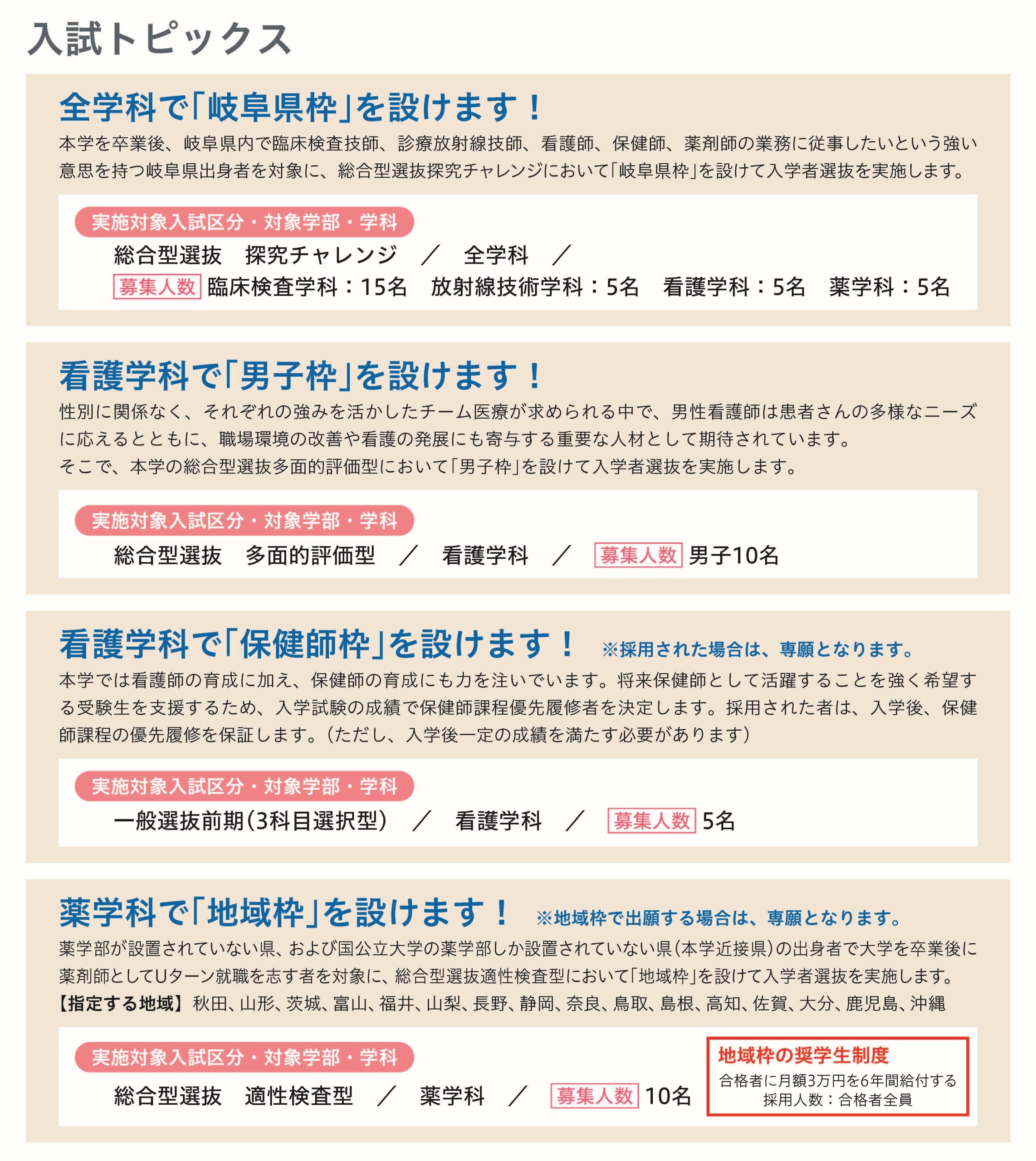 岐阜医療科学大学では、2026年度入学者選抜において、医療現場での多様性や地域ニーズに応える新たな取り組みとして、以下の募集枠を設けます。