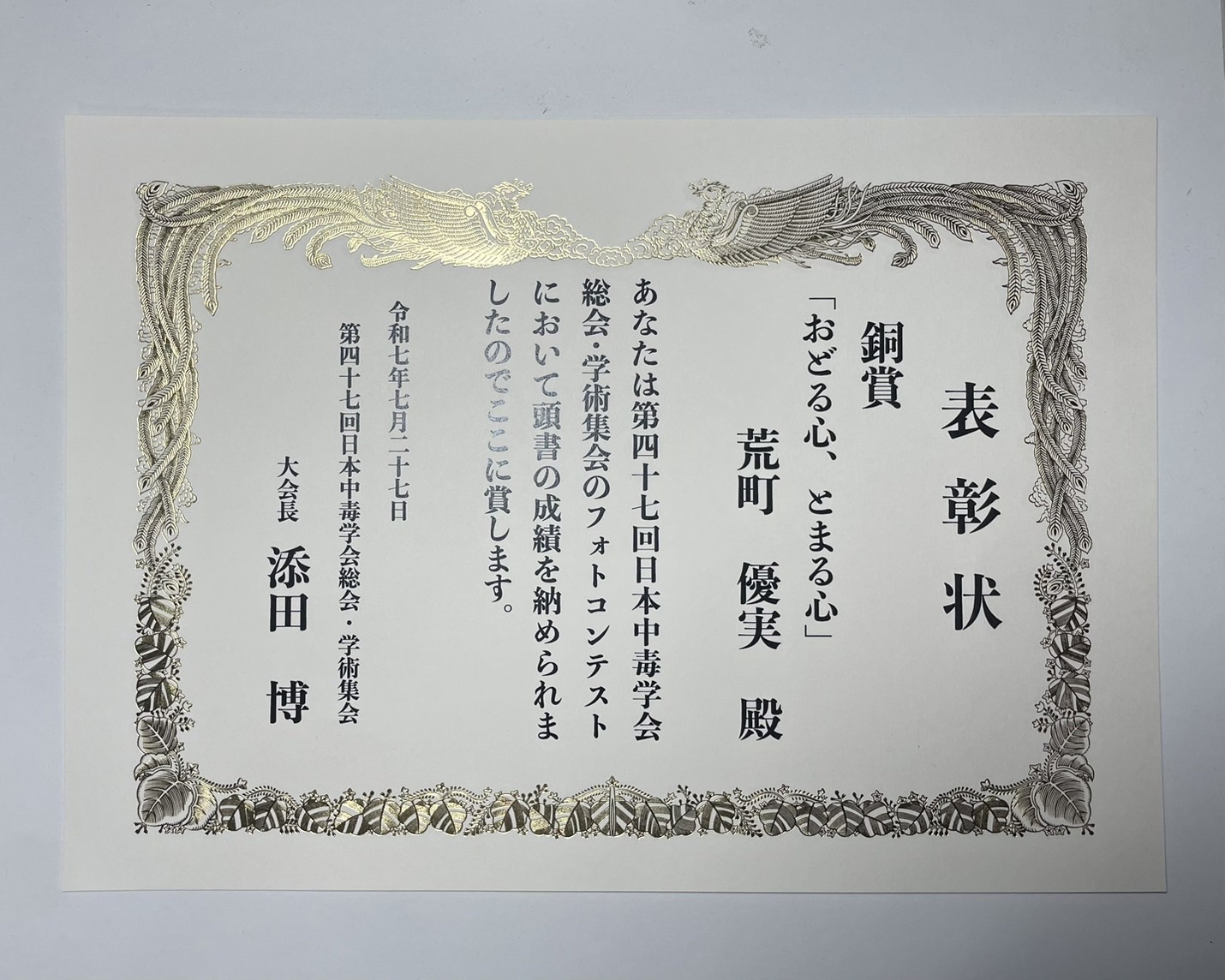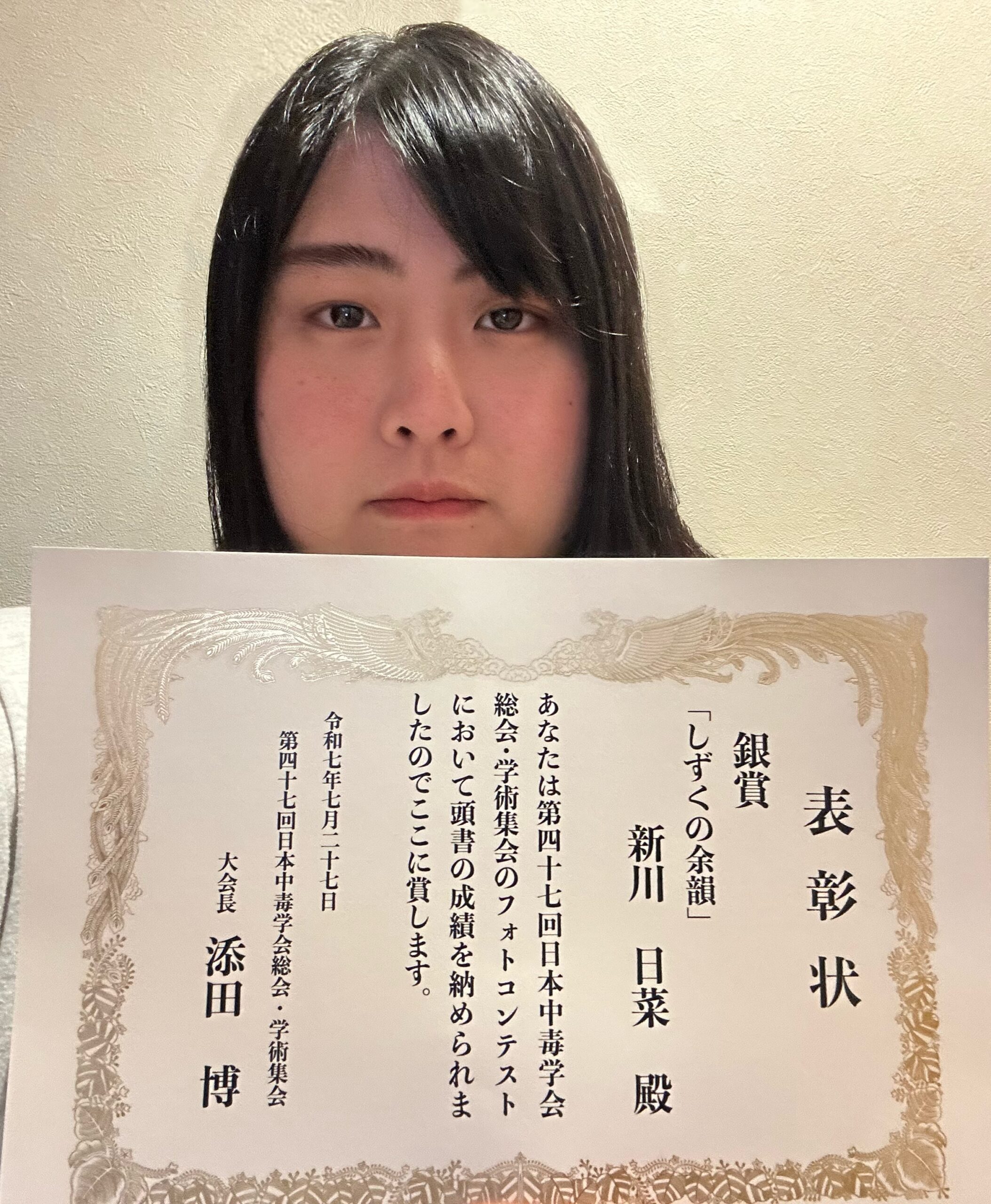 2025年7月26日(土)から27日(日)にかけて、東京のTFTホールにて開催された「第47回日本中毒学会総会・学術集会」にて、本学薬学部の学生2人がフォトコンテストに出展し、それぞれ銀賞と銅賞を受賞しました。多数の応募の中での栄誉ある評価となり、学生の洞察力と表現力が高く評価されました。
