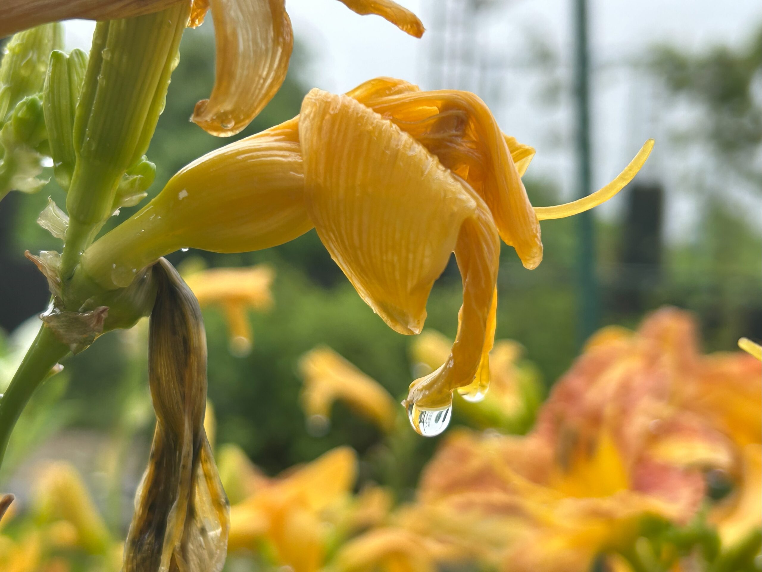 「雨音だけが響く中、同じ花の中で雨に打たれながらも最後まで咲こうとしている一輪に目を奪われました。その姿が印象的で、対称的に満開に咲く花と雨粒とともに残したいと思い写真に収めました。」