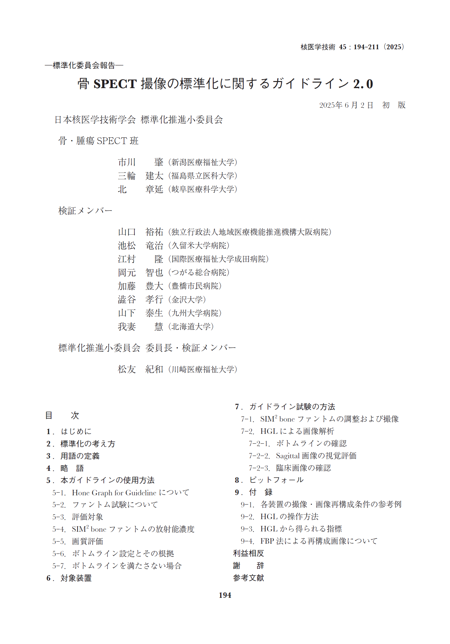 市川 肇, 三輪 建太, 北 章延. 骨SPECT撮像の標準化に関するガイドライン2.0. 核医学技術. 2025;45(3):194-211.