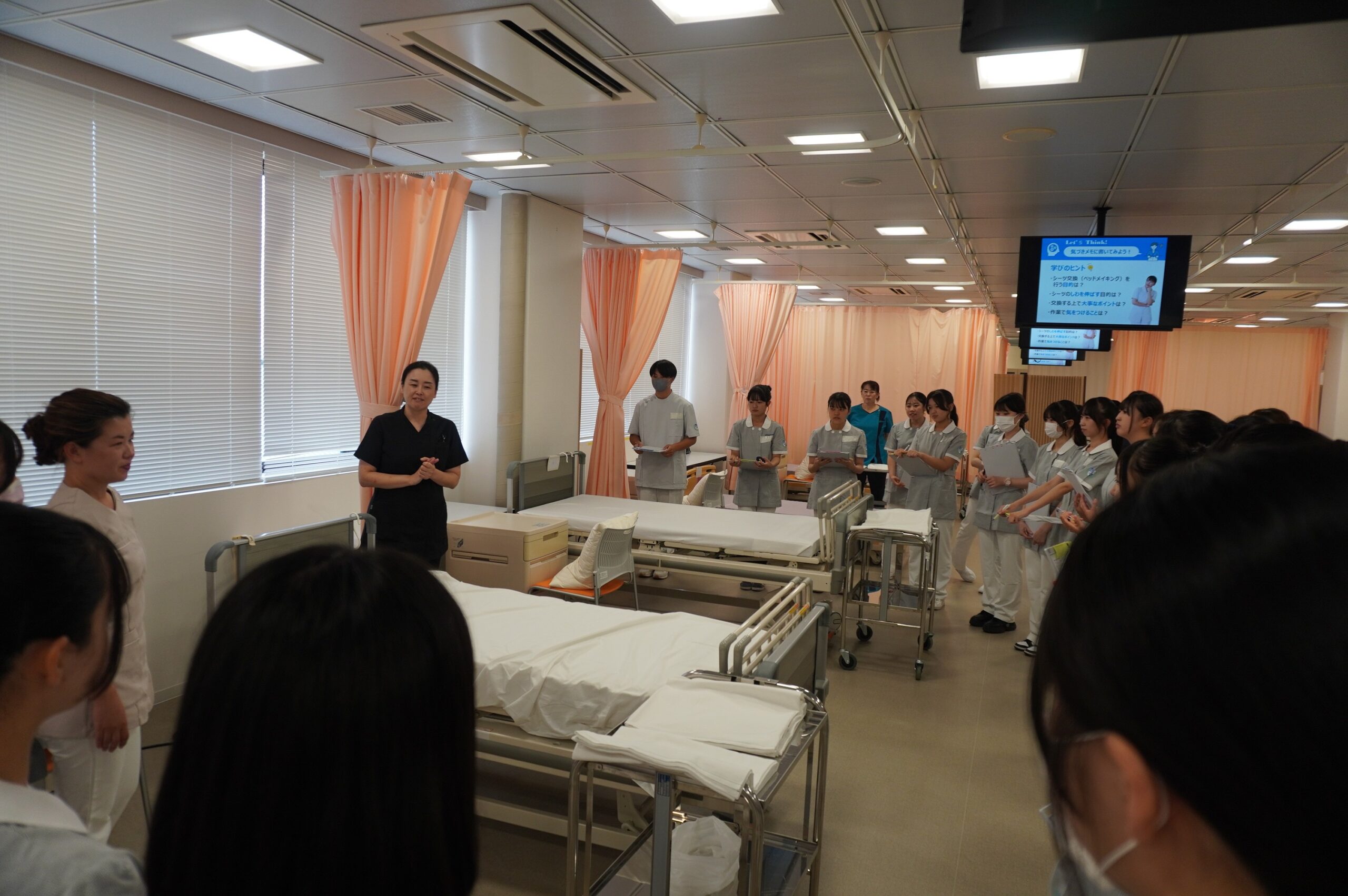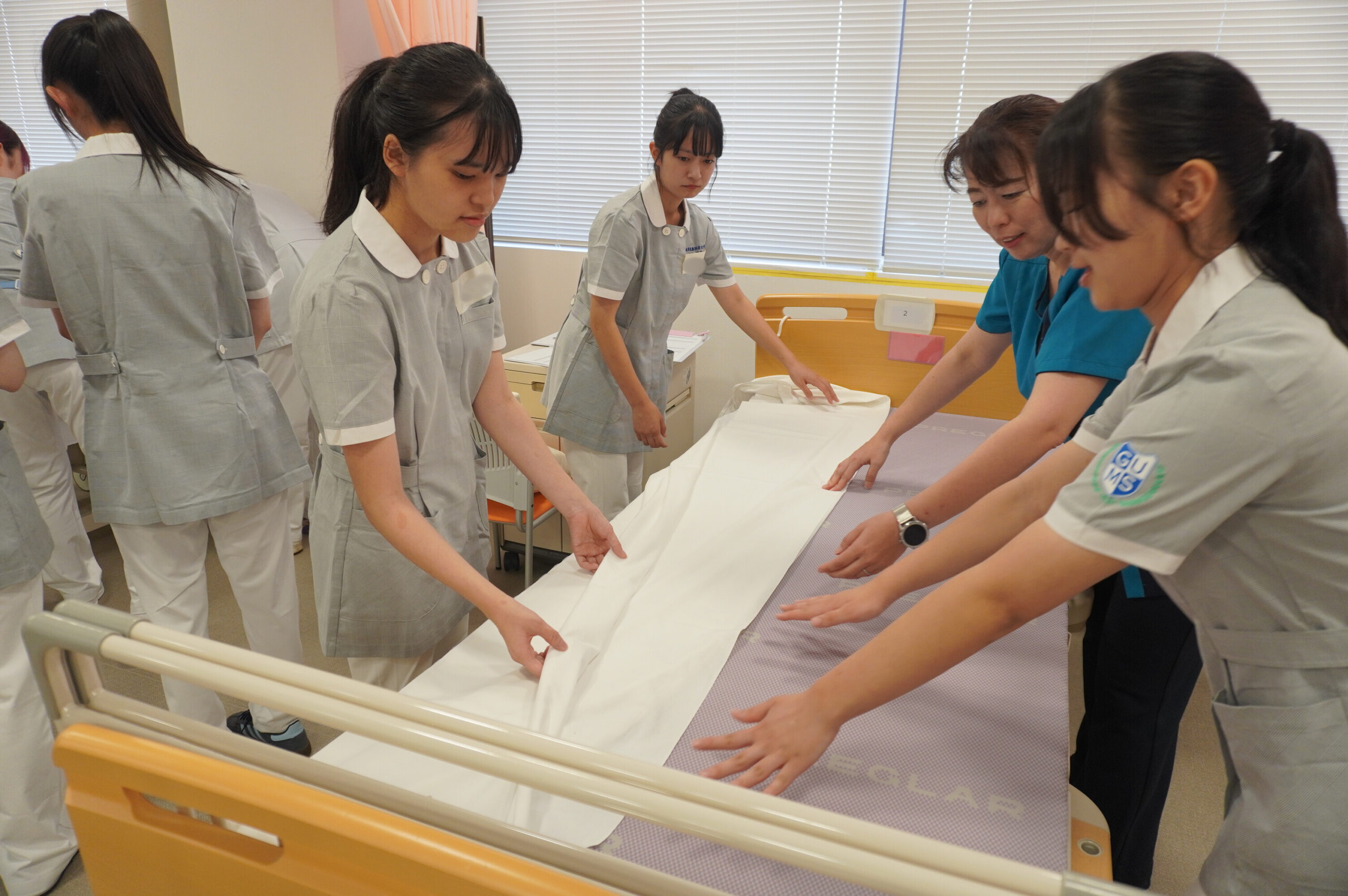 本学教員の指導のもとで行ったシーツ交換体験では、参加者同士が協力しながらベッドメイキングに挑戦。普段の生活では味わえない「看護の基本技術」を体験しました。