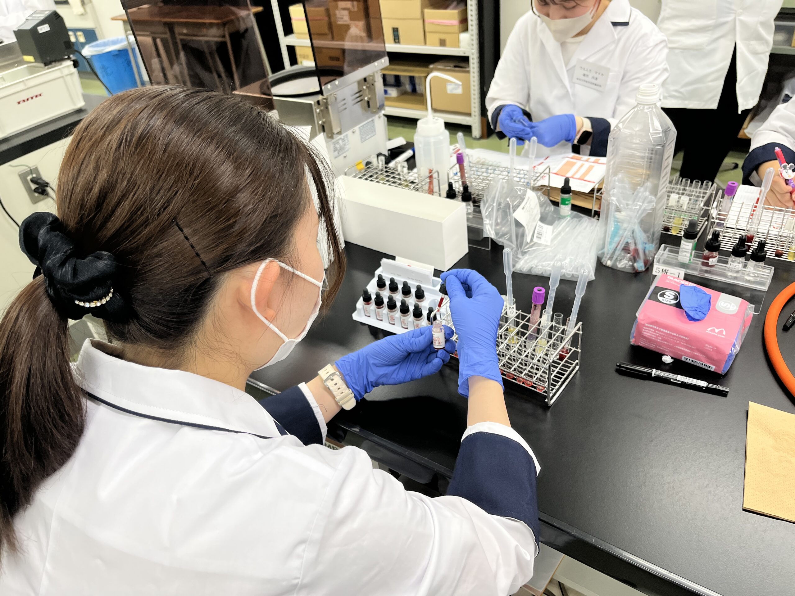 受講生の指導には臨床検査学科の中川泰久准教授、山田雄一郎准教授、田中ひとみ講師らが、サポートには輸血検査学実習を終えたばかりの3年生があたりました。