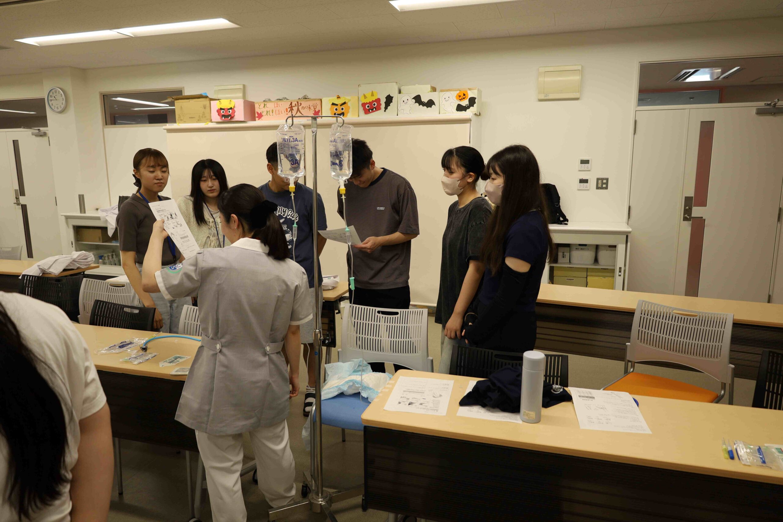 当日は看護学部から5人、薬学部から7人の学生が参加し、実習体験を通じて交流を深めました。