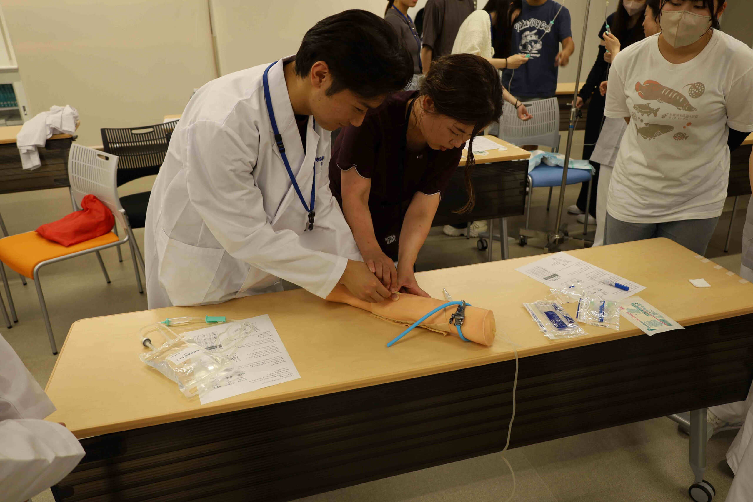 ・点滴体験を通して、針を刺す緊張感や患者さんの不安に寄り添う大切さを学びました。安全確認や清潔操作の重要性を実感し、看護師の責任の重さとやりがいを感じました。(薬学生)