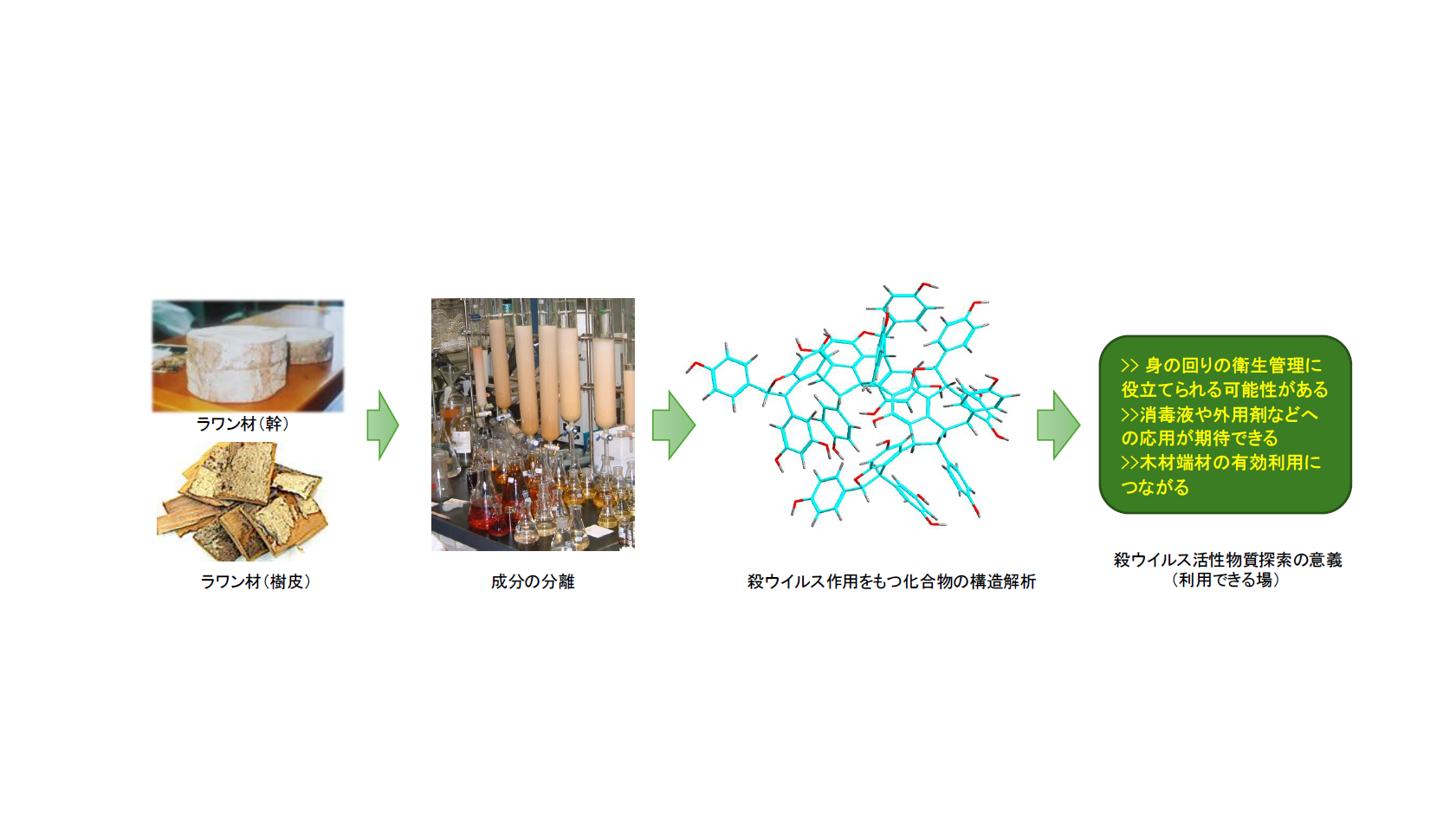 本成果は、これまで廃棄されてきたラワン材の端材から、感染症対策に資するウイルス不活化成分を発見したことで、木材資源の高付加価値化と衛生分野への展開を両立させ、環境負荷の低減と公衆衛生の向上に寄与する可能性があります。