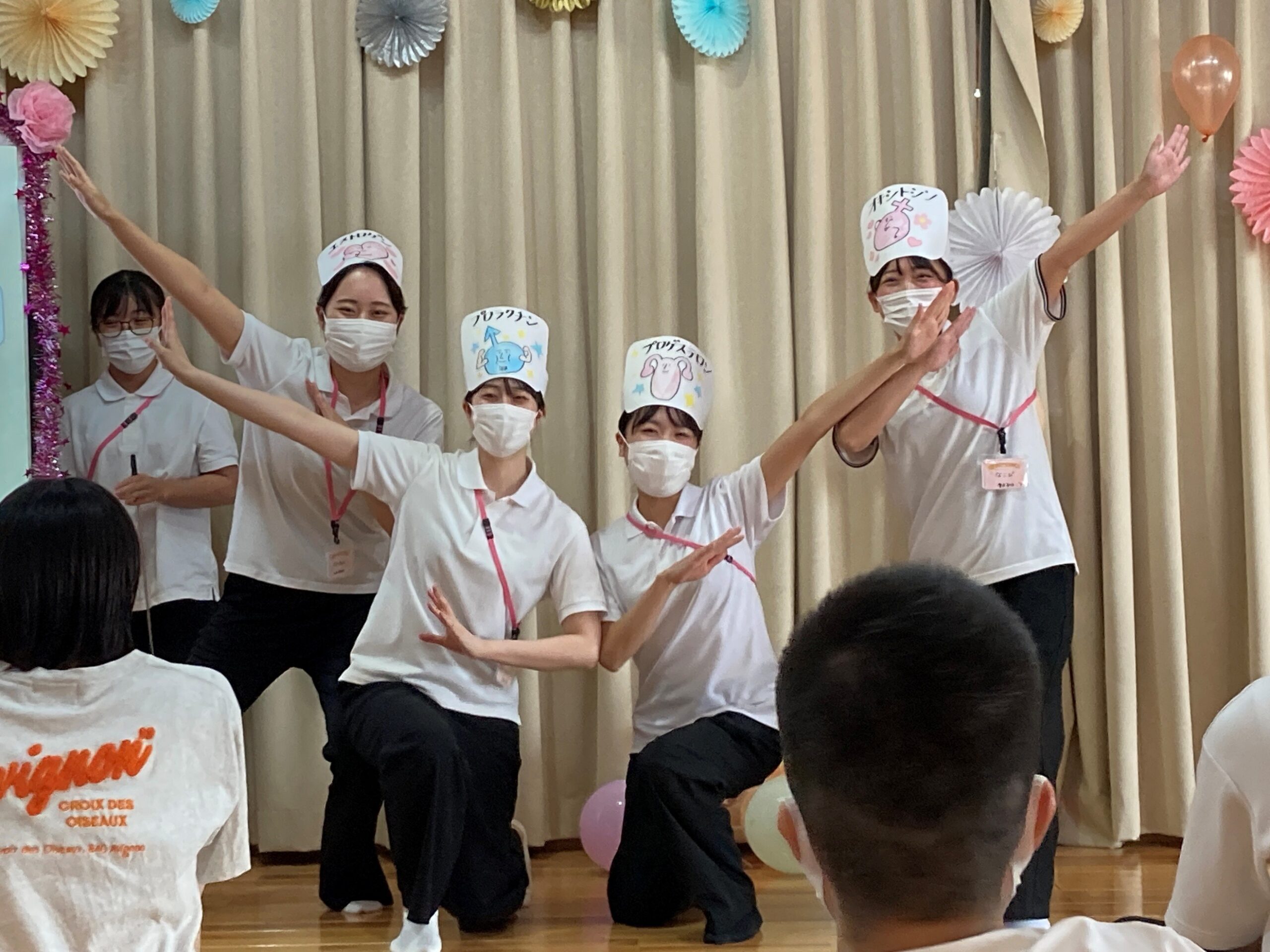お産と母乳に関わるホルモンについてレンジャーの 4 人が劇でわかりやすく教えてくれました。