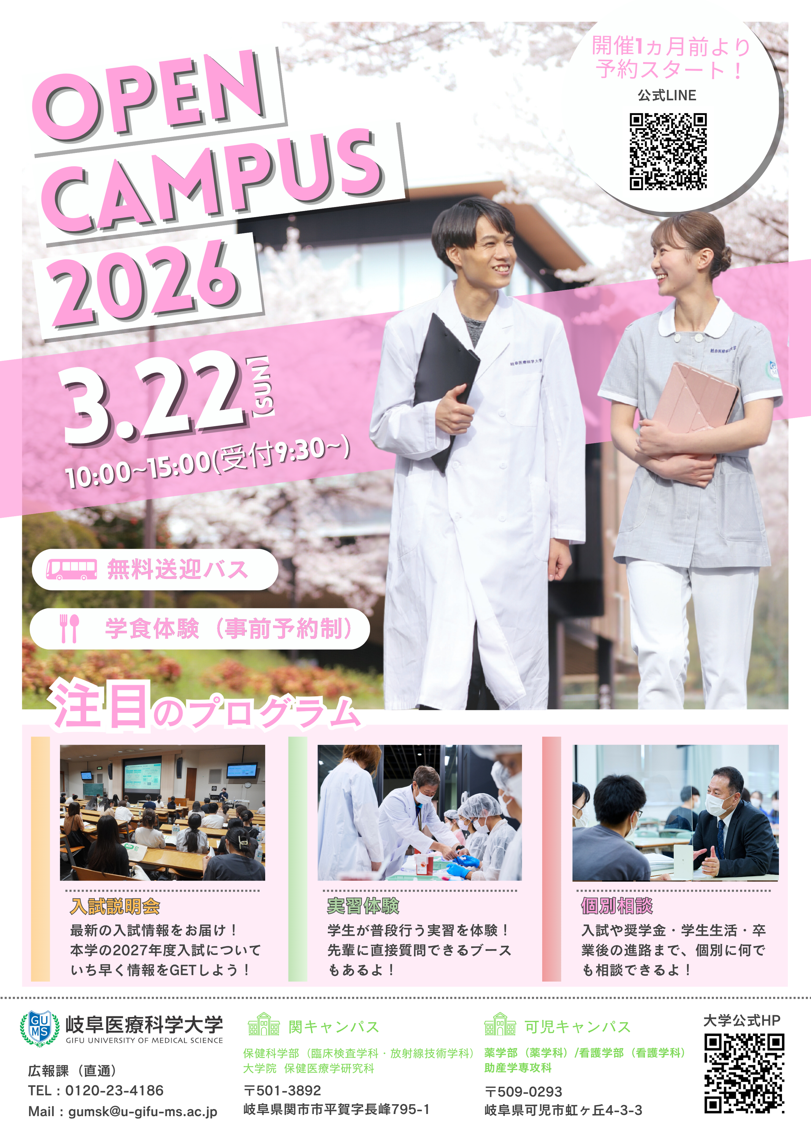 ※開催場所:関キャンパス(臨床検査学科/放射線技術学科)・可児キャンパス(看護学科/薬学科)