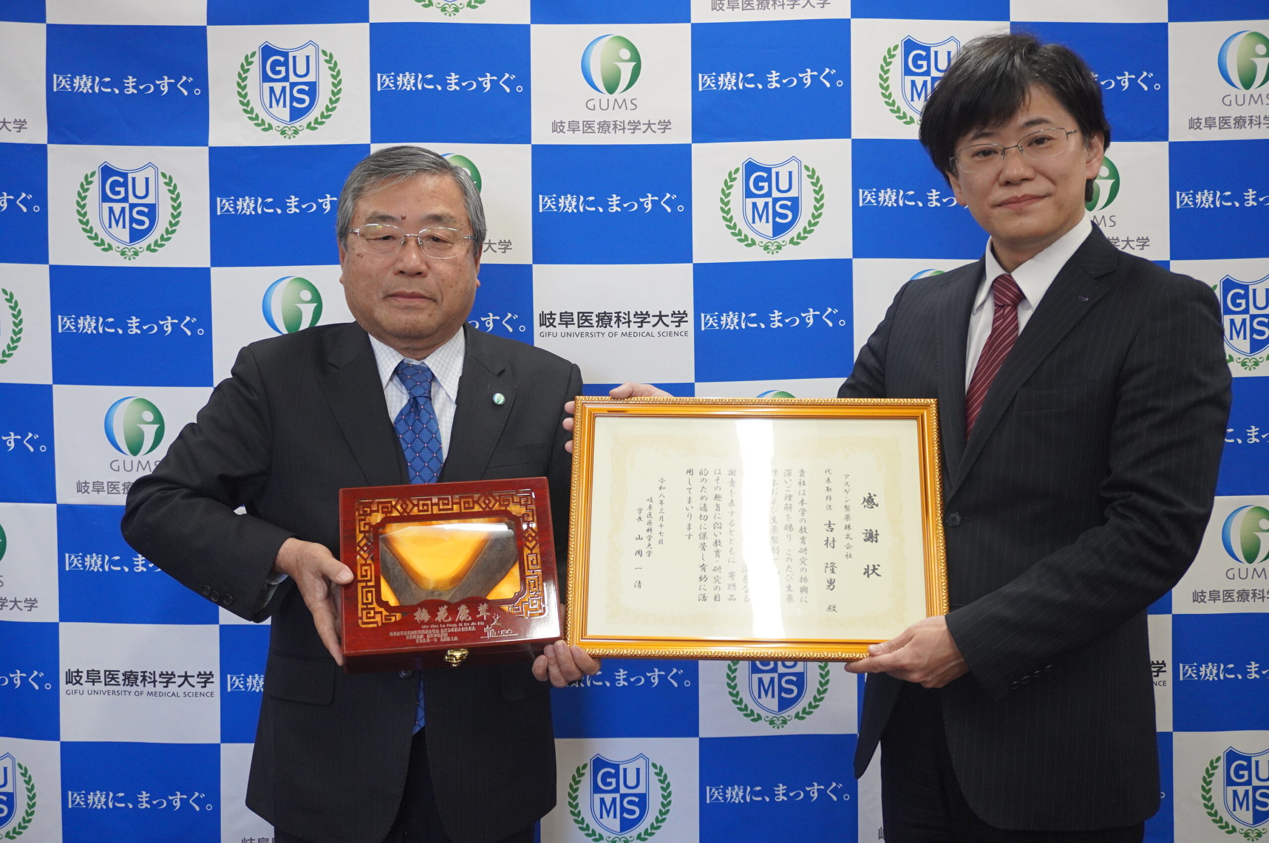 寄贈された生薬標本「鹿茸」を手にする岐阜医療科学大学の山岡一清学長(左)と、感謝状を受け取ったアスゲン製薬の吉村隆男社長